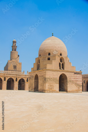 Tolon old Cairo, Ahmed Ibn Tolon Mosque, minaret and dome, islamic civilization and archeology, blue sky, shot is selective focus with shallow depth of field, taken at Cairo Egypt