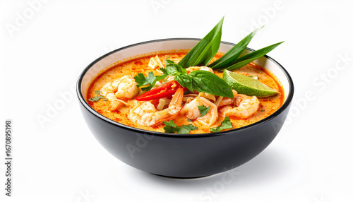 Tom Yum Soup with Shrimp, Lime, and Chili in a Black Bowl on White