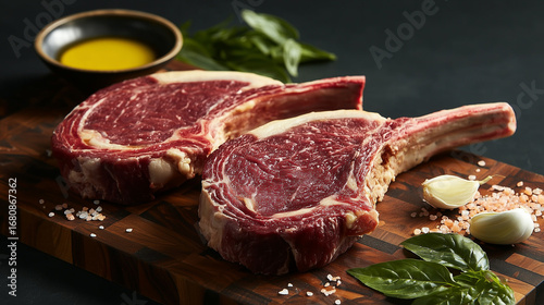 Tomahawk steak with seasoning and garlic