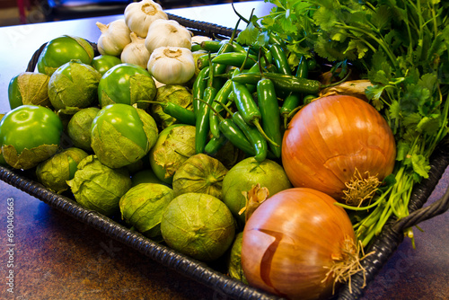 Tomatillos, Peppers, Cilantro, Garlic and Onions, Market Style Fresh Produce