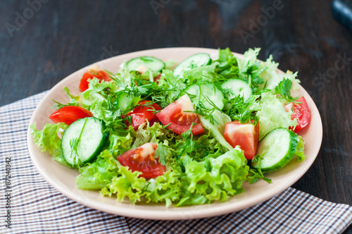 Tomato and cucumber salad with lettuce leafes