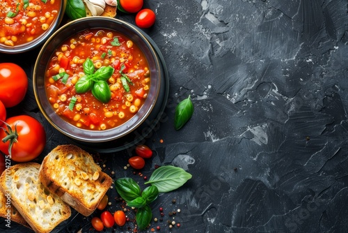 Tomato bean soup with pasta and toast on dark stone background Top view space for text