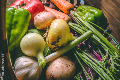 Tomato, cabbage, onion, potato, pepper, garlic, carrot and beetroot. Vegetables. Healthy food.