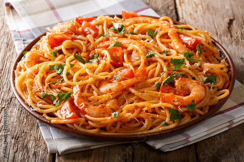 Tomato Fra Diavolo Sauce, Seafood and Pasta spaghetti close-up. Horizontal