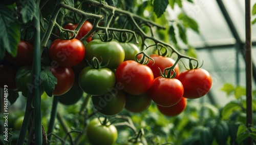 Tomato plants bearing ripe and unripe fruit in a greenhouse setting