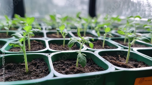 Tomato seedlings flourishing in green seedling trays under natural light indoors