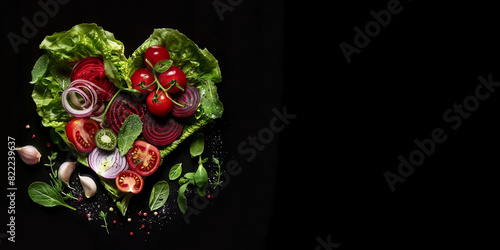 Tomatoes, beets, black garlic, white garlic, and green lettuce piled in the shape of a heart.