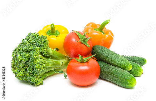 tomatoes, broccoli, peppers and cucumbers isolated on white back