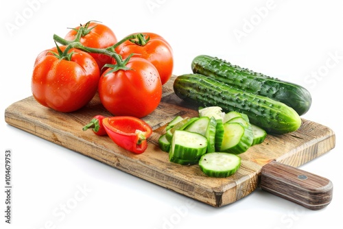 Tomatoes, cucumbers and bell peppers on a wooden cutting board. on a white background Show kitchen knives