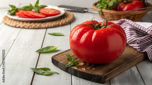 Tomato's Culinary Art: A vibrant still life showcases a ripe tomato, sliced tomatoes, and fresh basil leaves on a wooden cutting board.