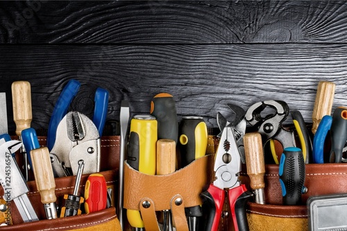Tool belt with tools on wooden background
