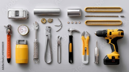Tool Set in the Workshop: A diverse collection of meticulously arranged hand tools, representing the essential implements used in construction and repair.