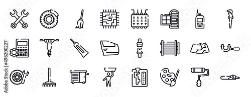 toolbox thin line icons collection. toolbox editable outline icons set. portable radio, adjustable spanner, mathematics, hydraulic breaker, caulk, car door stock vector.