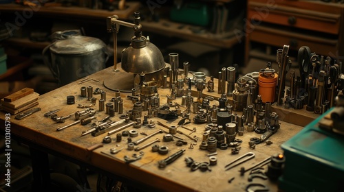 Tools and equipment used in piston replacement, displayed neatly on a workbench.