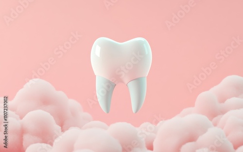 Tooth floating above pink clouds in a whimsical setting. dental and dentis concept.