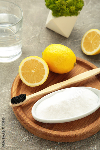 Toothbrush with lemon and baking soda on grey background. Vertical photo