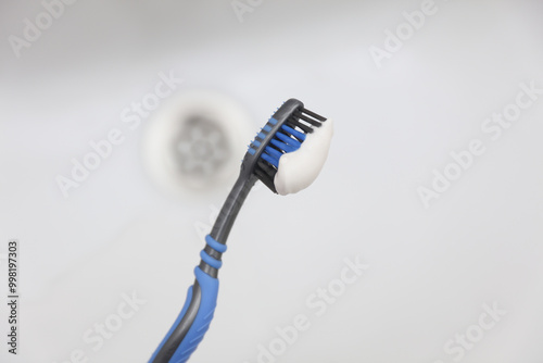 Toothbrush with toothpaste over sink close up