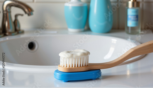 Toothbrush with white toothpaste resting on blue holder, dental hygiene. Dental Day.