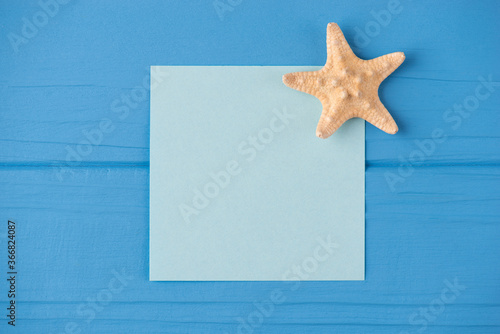 Top above overhead view close-up photo of a blank note with a small starfish isolated on blue wooden background with copyspace