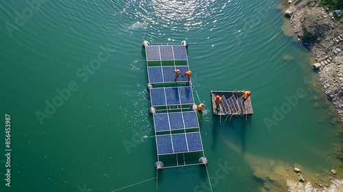 Top aerial of Male workers repair Floating solar panels on water lake Engineers construct on site Floating solar panels clean energy for future living Industrial Renewable energy of gr : Generative AI
