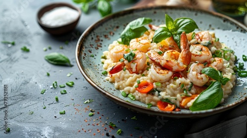 Top angle of a rich seafood risotto, featuring prawns and scallops, served in a sophisticated style on an isolated backdrop