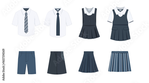Top angle view of a series of different school uniforms arranged neatly, showcasing various styles, colors, and designs, ideal for education, fashion, student life, and cultural diversity concepts