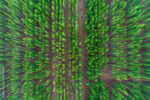 Top down aerial landscape of pine trees rows in plantation, Melbourne, Australia