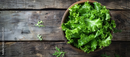 Top down view of a fresh green lettuce salad on a rustic wooden table Ideal for text placement Healthy dietary option with copy space image