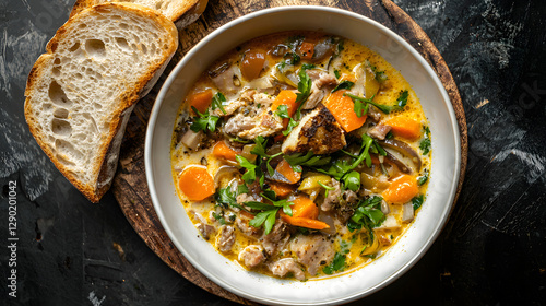 Top Down View of Belgian Waterzooi in Deep Bowl with Bread