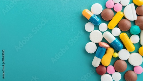 Top down view of pharmaceutical pills. Colourful prescription tablets on a plain background. Copy space for text. Marketing healthcare banner with empty space on righ side