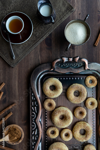 Top down view of sugar and cinnamon donuts on a vintage tray along with a cup of tea with cream and sugar.