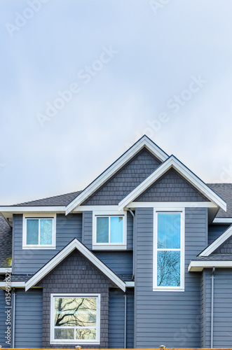 Top of luxury house with shingle roof, red and yellow trees and nice windows in Summer in Vancouver, Canada, North America. Day time on June 2024.