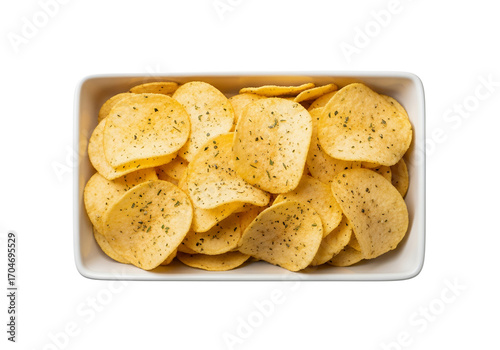 Top view A potato chips with rectangular white ceramic bowl, white background isolated