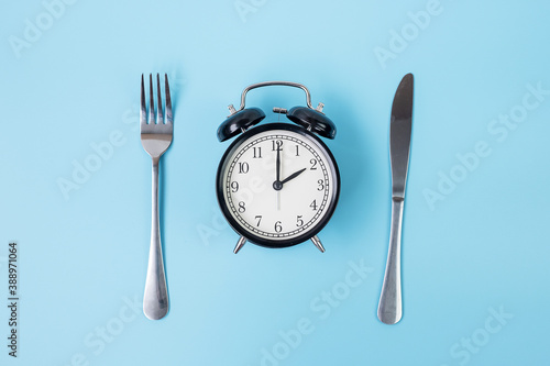 Top view alarm clock with knife and fork on blue background. Intermittent fasting, Ketogenic dieting, weight loss, meal plan and healthy food concept