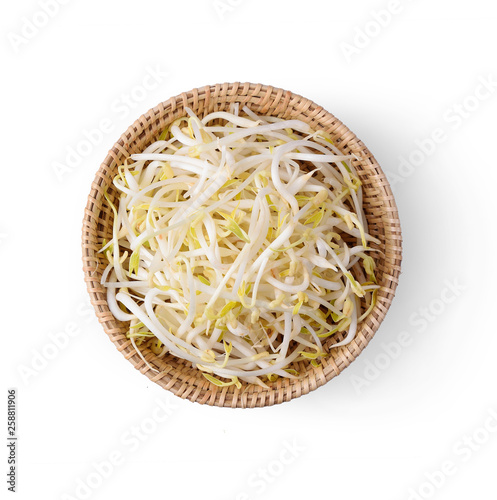 top view Bean Sprouts in bamboo bowl isolated on white background