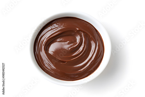 Top view chocolate ganache topping isolated on white background. Glossy chocolate glaze swirl