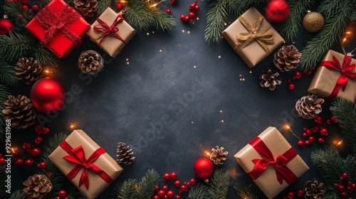 top view Christmas foliage with baubles, present boxes and pine cones on black grungy background, minimal style seasonal holiday frame