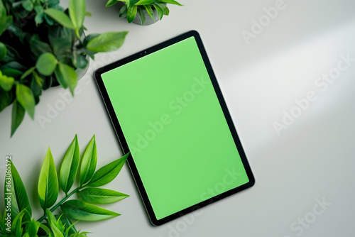 Top view. Chroma key green screen of a tablet on white surface decorated with plants. Generative AI