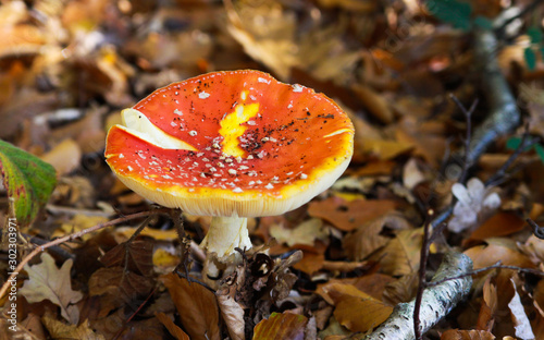 Top view close up of isolated toadstool (amanita muscaria, fly agaric) with brown foliage background - Germany