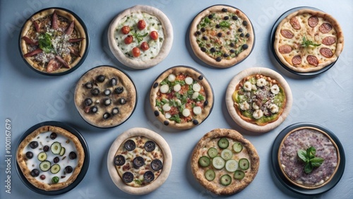 Top view collection of Pizza with different tasty isolated on background, Popular fast food, flat lay pizzas.