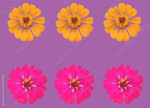 Top view, Collection set of pink and yellow zinnia flower blossom blooming isolated on purple background for stock photo, house plants, spring floral