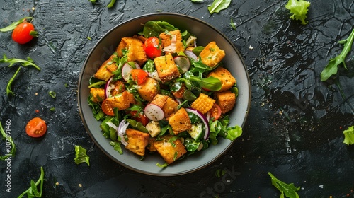 Top view cornbread salad, bowl of salad with tofu, tomatoes, onions and herbs on black background, appetizer cooking barbecue grill dieting