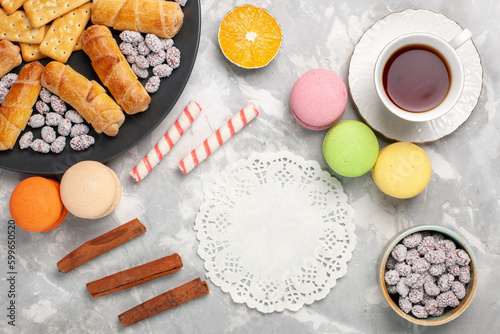 top view delicious bagels with crackers macarons and cup of tea on the white desk cake biscuit sweet sugar pie cookie crisp