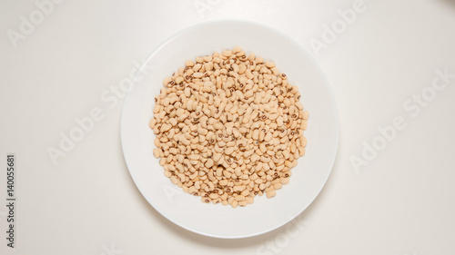 TOP VIEW: Dried white beans on a white dish