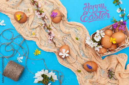 Top view for easter decor, painted eggs on bright blue background with text "Happy Easter" and spring flowers. Bright preparation of Easter cards. Orthodox and Catholic holiday. family celebration
