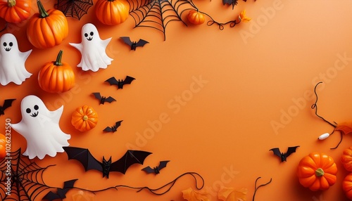 top view halloween concept with garland pumpkins ghosts spiders and bats on orange background