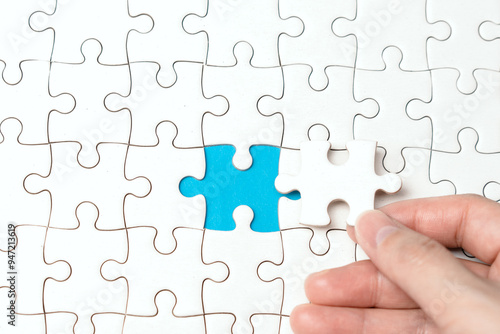 Top view hand holding flat lay of white jigsaw puzzle to connecting game texture incomplete or missing piece on a blue background, replenishment.