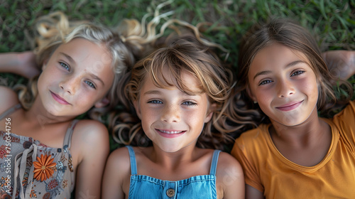 Top view happy girls lying on the grass. Girls smiling, friendship and childhood. Children's Day.