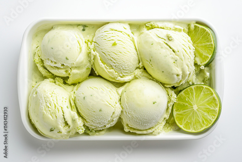 Top view lime gelato tray isolated on white background, Selective focus green lime ice cream tray with sliced of lime on white.
