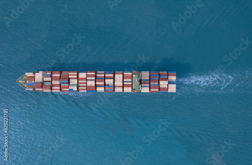 Top view Logistics and transportation of Container Cargo ship and Cargo plane with working crane bridge in shipyard at sunrise, logistic import export and transport industry background